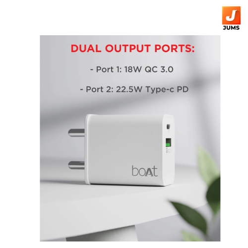 The boAt WCDV 22.5W QCPD Dual Port Wall Charger with 18W Quick Charge 3.0 and 22.5W Power Delivery support is the answer to all your charging needs. Its smart IC protection offers built-in surge protection, short circuit protection, over current protection & overheat protection. With universal compatibility, it will connect to all Micro-USB, Type C and Power Delivery cables. Its built-in auto-detect charging (Max 22.5W) adapts to your device’s charging needs automatically. The durable capacitors have up to 10000 cycles and is aptly complimented by its corrosion resistant pins.