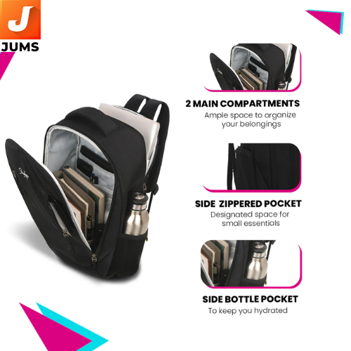 Capacity: ~16 L — compact everyday size great for school, work or commuting. Material: Durable Matty/polyester fabric for everyday wear. Closure: Secure zip closure on all main compartments. Unisex Style: Simple black design suitable for all users.2 Spacious Compartments: Main storage areas for daily essentials and tech. Front Pocket & Organizer: Helps sort smaller items and accessories. Laptop Compatible Section: Fits laptops up to 15.6″, protecting your device. File Pocket: Additional inner pocket for documents and folders. Side Zippered Pocket & Mesh Bottle Holders: Easy access for water bottles or quick items.