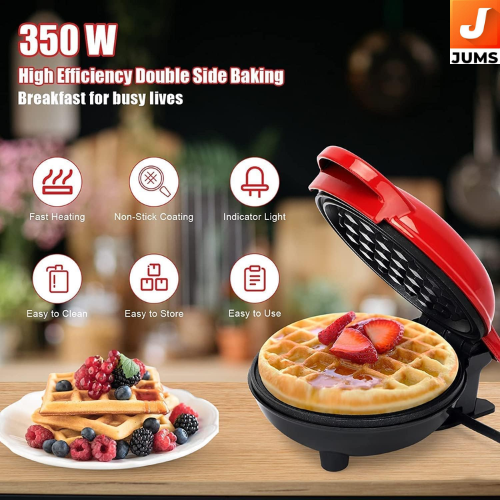 Power: 350 W — quick heating for small-batch cooking like waffles and snacks. Size: 4-inch cooking surface — makes 1 waffle at a time (good for singles or quick bites). 3-in-1 Function: Can make waffles, pancakes, and grilled sandwiches/snacks with the same unit (multi-use appliance). Non-Stick Plates: Non-stick coating for easy food release and wash-up.