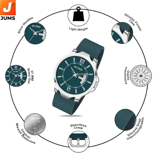 The Matrix Antique 2.0 Day & Date Softest Silicone Strap Analog Watch is a casual, budget‑friendly wristwatch designed for men and boys, featuring a classic analog display with convenient day & date windows and a stylish brass‑tone dial. It’s powered by Japanese quartz movement with long‑lasting batteries and built with a soft, comfortable silicone strap paired with a stainless steel case, making it suitable for everyday wear.