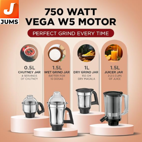 750 W Vega W5 Motor: Powerful motor for efficient wet/dry grinding, chutneys, batter, and juicing tasks. 4 Versatile Jars Included: Comes with 3 stainless-steel jars and 1 Master Chef Plus food processor jar for chopping, slicing, grating and kneading. Flexi Lids: Adjustable lids let you reduce jar capacity when needed (e.g., convert 1.5 L jar to ~1.0 L) for better control on small quantities. Turbo Mini Spice Jar: Small 0.2 L jar ideal for grinding tiny spice amounts.