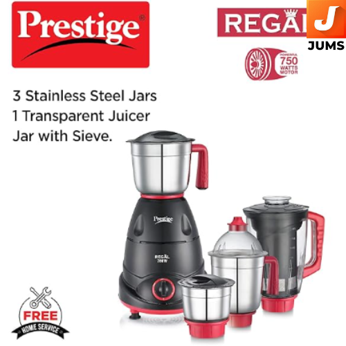 The Prestige Regal 750 W Mixer Grinder is a reliable and versatile kitchen appliance ideal for daily food preparation in Indian households. Engineered with a powerful 750 W motor, it delivers strong performance for tasks like wet grinding, dry grinding, chutney making, and juicing. The appliance includes four jars — three stainless-steel jars for versatile grinding (wet, dry, and chutney) and a transparent juicer jar with a sieve, which makes it easy to prepare fresh juices and smoothies. Its 3-speed control lets you customize the texture of your grind, while ergonomic jar handles and a sturdy ABS body ensure comfortable handling and long-lasting use. The transparent jar allows you to see the progress while juicing, and stainless-steel blades offer efficient cutting and grinding across ingredients. With 2 years of warranty and ISI certification, this mixer grinder combines performance, safety, and reliability — making it a popular, fast-moving choice for everyday kitchen needs.