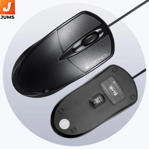Zebronics Byte Wired Optical Mouse (often simply called Zeb‑Byte) is a basic compact wired USB mouse from Zebronics designed for everyday computer use. It features an ergonomic and lightweight design that’s comfortable for long work or study sessions, an optical sensor with ~1000 DPI for smooth cursor tracking, and 3 standard buttons (left, right, scroll) for simple navigation.
