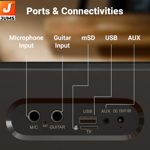 Includes wireless UHF microphone with controls, plus 6.3 mm mic and guitar input jacks — ideal for karaoke or instrument performance. Karaoke and Recording: Sing along to your music and record performances directly to USB/mSD storage. Dedicated Controls: Physical knobs/buttons let you adjust media, volume, and bass easily, with an LED display for mode/status
